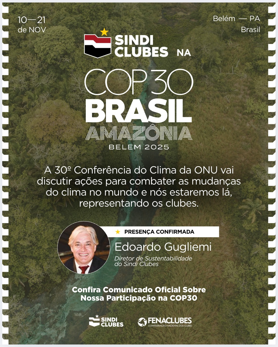 11/11/2025O futuro dos clubes passa pela sustentabilidade e o Sindi Clubes marca presença na 30ª COP30 - Conferência do Clima da ONU com o Diretor de Sustentabilidade, Edoardo Guglielmi.